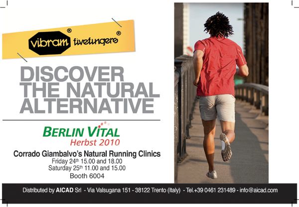 Das Barfußlaufen ist kein Laufstil, den man von heute auf morgen umsetzen kann. Er erfordert eine Eingewöhnungsphase und einen stufenweisen Ausbau. Deswegen setzt Vibram® hier auf erfahrene Tester, wie Corrado Giambalvo, die ihre Erfahrungswerte teilen und bei der Entwicklung helfen. Der engagierte Läufer absolvierte für Vibram® bereits 4 Marathons in den FiveFingers. Auch den Berlin Marathon am 26.9.2010 wird Corrado im Modell Bikila von Vibram® bewältigen. Am 24.9. (15 und 18 Uhr) und 25.9.2010 (11 und 15 Uhr) bietet der Marathon-Spezialist Laufschulungen zum Natural Running an und steht den Besuchern mit Rat und Tat zur Seite. Ihr findet ihn am Messestand (Nr. 6004) von Vibram® FiveFingers.