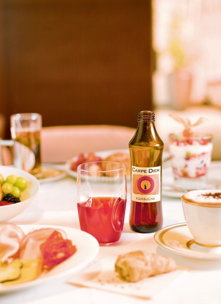 Ungekühltes Carpe Diem Kombucha besitzt eine stoffwechselanregende Wirkung und rundet somit das Frühstücksmenü ab.