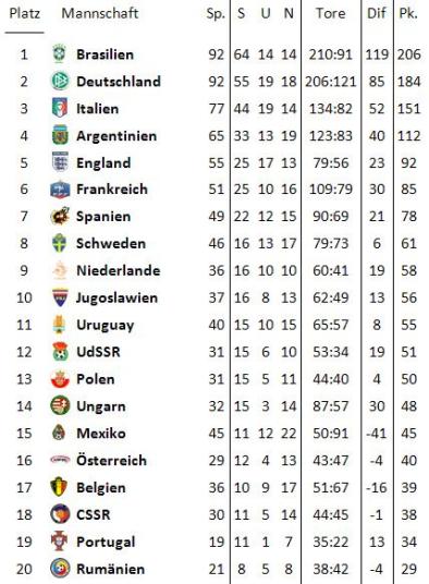 Hier ist sie also, die ewige WM-Tabelle. Deutschland liegt auf Position Zwei, hinter Brasilien, die allerdings auch an zwei Weltmeisterschaften mehr teilnahmen. In der ewigen WM-Tabelle zahlen sich die vielen Final- und Halbfinalteilnahmen Deutschlands also aus.