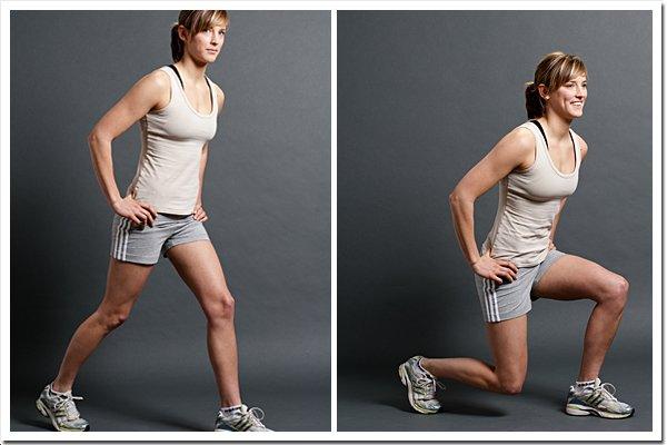 Die Ausgangsposition ist schulterbreit, die Füße zeigen in Blickrichtung. Von da machst Du einen weiten Schritt nach vorne und fängst den Schwung mit dem vorderen Bein ab. In der Endposition bilden Unter- und Oberschenkel wieder einen 90Grad-Winkel.