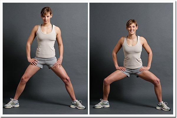 Die Grundstellung ist überschulterbreit mit nach außen gedrehten Füßen. Von da gehst Du ebenfalls langsam nach unten, bis die Oberschenkel parallel zum Boden sind. Kurz halten und wieder zurück in die Grundstellung.