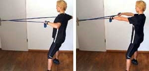 Macht das Thera-Band an einem Türgriff oder einem anderem fixen mittelhohem Punkt fest. Greift mit je einer Hand ein Ende geht mit den Armen so weit wie möglich nach hinten, bis das Band bei gestreckten Armen gespannt ist.