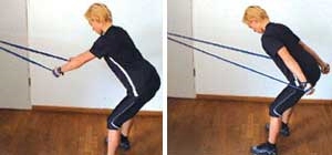 Die Füße sind hüftbreit geöffnet und stehen auf dem Band, Bauchmuskeln und Po sind angespannt, die Schulterblätter nach hinten und das Band fest in den Händen halten.