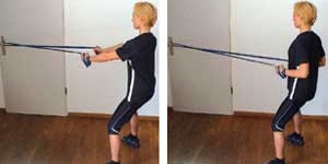 Die Arme sind fast vollständig gestreckt, das Band sollte also schon vor der eigentlichen Ausübung straff gespannt sein. Mit dem Ausatmen führt ihr die Arme nach vorne und oben und geht dabei in die Hocke, wie normale Kniebeuge.