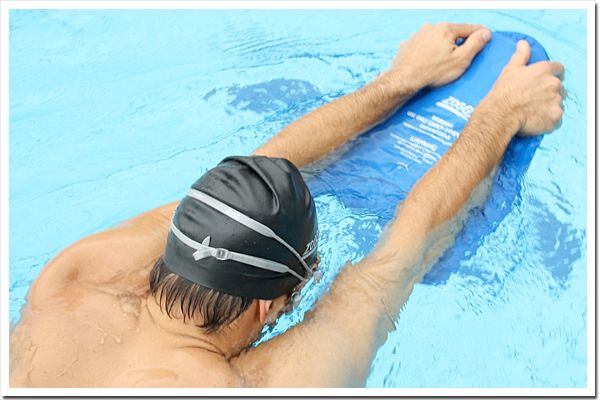 Der Bewegungsradius in Hüft- und Kniegelenk ist gering. Am Besten übst Du den Beinschlag mit einem Kickboard (bspw. von Zoggs für zirka 18 Euro) und hältst dabei den Kopf gestreckt mit dem Gesicht im Wasser. Nur ab und zu solltest Du nach vorne Luft holen. Achte dabei auf einen gleichmäßigen Rhythmus; nicht wild ins Wasser treten. Damit verschwendest Du viel Energie. Beim Triathlon spielt der Beinschlag ohnehin nur eine stabilisierende Rolle.