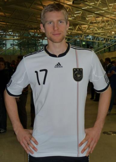 Vor den Augen der beiden Ehrenspielführer, Uwe Seeler und Franz Beckenbauer, sowie Bundestrainer Joachim Löw, präsentierten die aktuellen Nationalspieler Bastian Schweinsteiger, Philipp Lahm, Per Mertesacker und Kapitän Michael Ballack das Trikot, in dem die Deutsche Elf im nächsten Jahr um den Titel spielen wird.