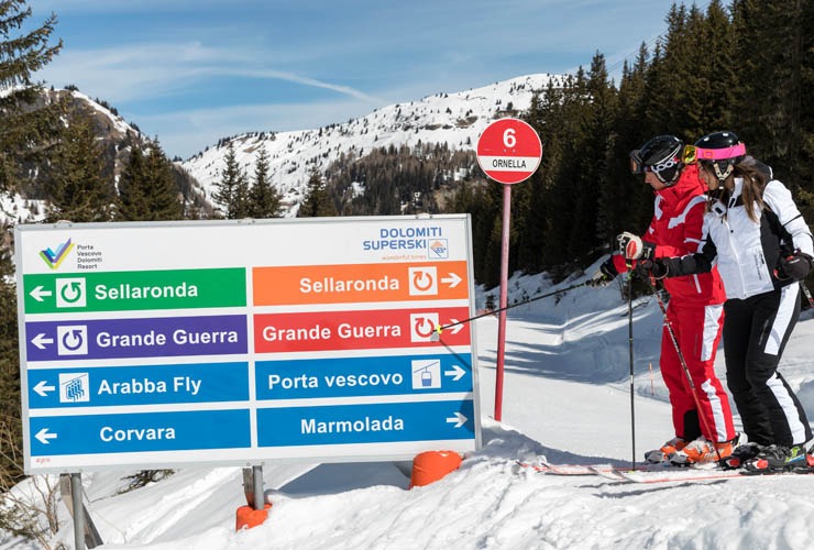 Eines der Highlights in den Dolomiten ist die in den 1970ern erschlossene, 26 Kilometer lange Sellaronda. Längst ein Klassiker, absolviert ein geübter Skifahrer das Skikarussell in etwa vier Stunden. Für sportliche Fahrer wäre es also durchaus möglich, sie zweimal am Tag zu fahren. Allerdings empfiehlt es sich, Zeit mitzubringen und einige Panoramastopps auf der Runde einzulegen. Einfach nur, um den Blick auf die berühmten Bergspitzen der Langkofel-Gruppe, Rosengarten, Civetta und der Sellagruppe zu genießen. Man kann die Runde mit (orange Beschilderung) oder gegen (grüne Beschilderung) den Uhrzeigersinn fahren. Das praktische daran: Ganz gleich in welche Richtung man sie fährt, anhand ihrer Beschilderung kann man ihr problemlos ohne Pistenplan folgen.