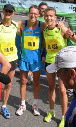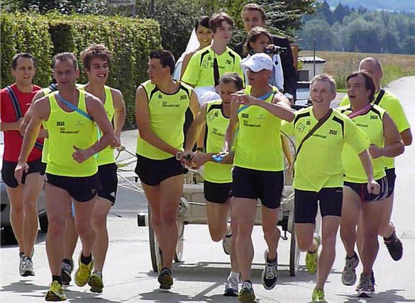 Im Januar 2008 beendete er die 4-monatige Therapie. Im April startet er bei seinem ersten Wettkampf. „Das Training war zäh, ich begann mit einem 6er Schnitt und Schwindel, aber es fühlte sich alles richtig an.“ Im September 2009 löste er seinen Start beim Tübinger Stadtlauf ein. Dieter Baumann begrüßte ihn persönlich (Foto). Bei Hodenkrebs sagt man, wenn nach 3-5 Jahren nichts mehr nachkommt, hat man es überstanden. Das vierte Jahr danach ist nun vorbei, er ist pumperlgesund, wie der Bayer sagt. In diesem Jahr hat Stefan Linda geheiratet. Vor die Hochzeitskutsche waren keine Pferde gespannt, die Läufer seiner Dienstagsgruppe zogen das Paar (Foto). Geflittert haben sie auf den Seychellen. „Mit wunderbaren Strandläufen.“ (Foto)